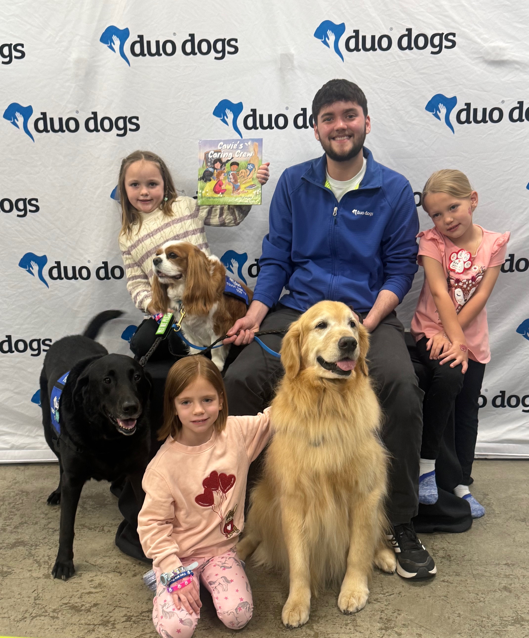 Duo Touch Therapy Dog Trainer James with the real Caring Crew and young readers!